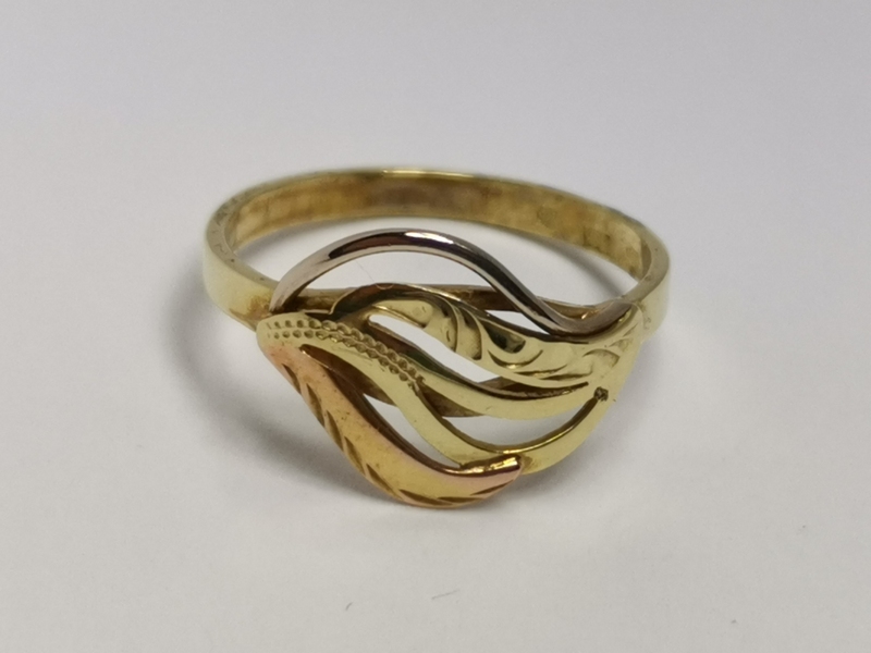 Krásný bohatý zlatý prsten ze žlutého a červeného zlata. Je zdoben ručním rytím. Velikost 53 patří mezi velikosti středního prstu.