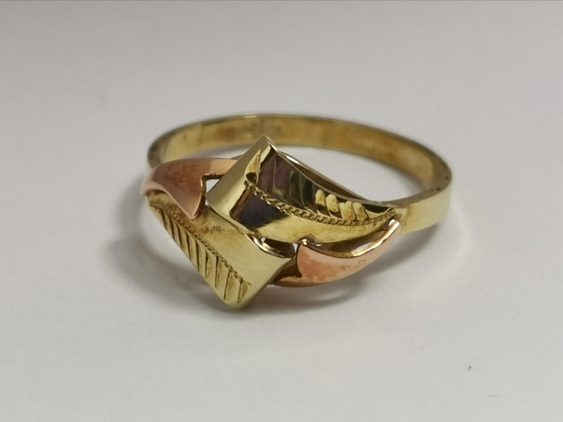 Krásný bohatý zlatý prsten ze žlutého a červeného zlata. Je zdoben ručním rytím. Velikost 54 patří mezi velikosti středního prstu.