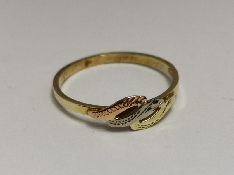 Krásný, jemný zlatý prsten ze žlutého, bílého a červeného zlata. Je zdoben ručním rytím. Velikost 49 patří mezi velikosti malého prstu.