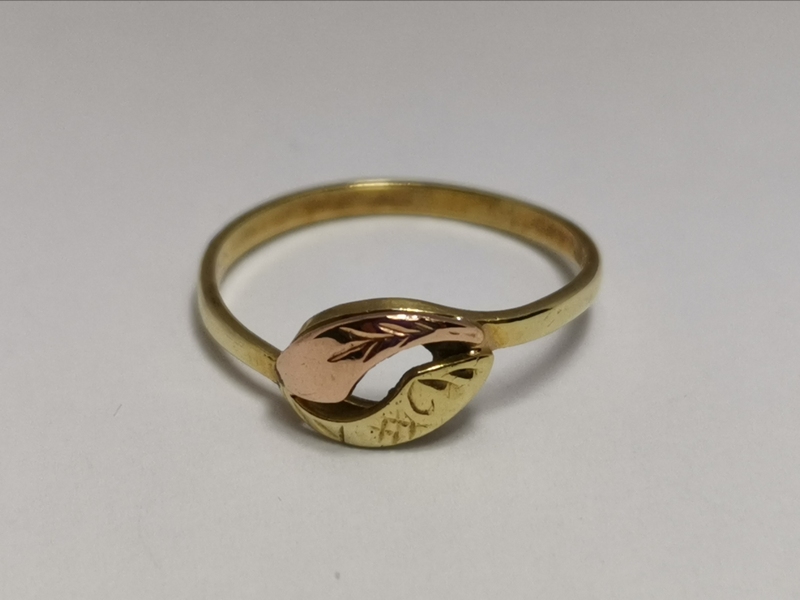 Krásný, jemný zlatý prsten ze žlutého a červeného zlata. Je zdoben ručním rytím. Velikost 47 patří mezi velikosti malého prstu.