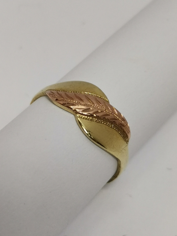 Krásný, elegantní zlatý prsten ze žlutého a červeného zlata. Je zdoben ručním rytím. Velikost 50 patří mezi velikosti malého prstu.