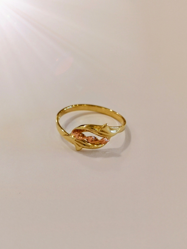 Krásný zlatý prsten, zdobený lístky ze žlutého zlata a spirálou ze zlata červeného. Je klasického designu. Velikost 51 patří mezi velikosti dámského malého prstu.