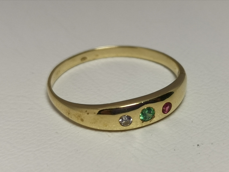 Krásný zlatý prsten, zdobený třemi malými barvenými zirkony ( červený, zelený, bílý). Malé zirkonky svou barevností jednoduchý prsten krásně rozzáří. Je moderního designu. Velikost 55 patří mezi velikosti normálního prstu. Prsten je velice jemný.