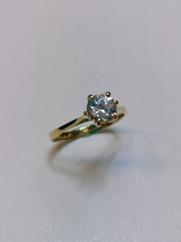 Krásný prsten ze žlutého zlata, zdobený krásným, velkým zirkonem. Je klasického designu. Velikost 53 patří mezi velikosti menšího prstu. Prsten může být použit jako zásnubní.