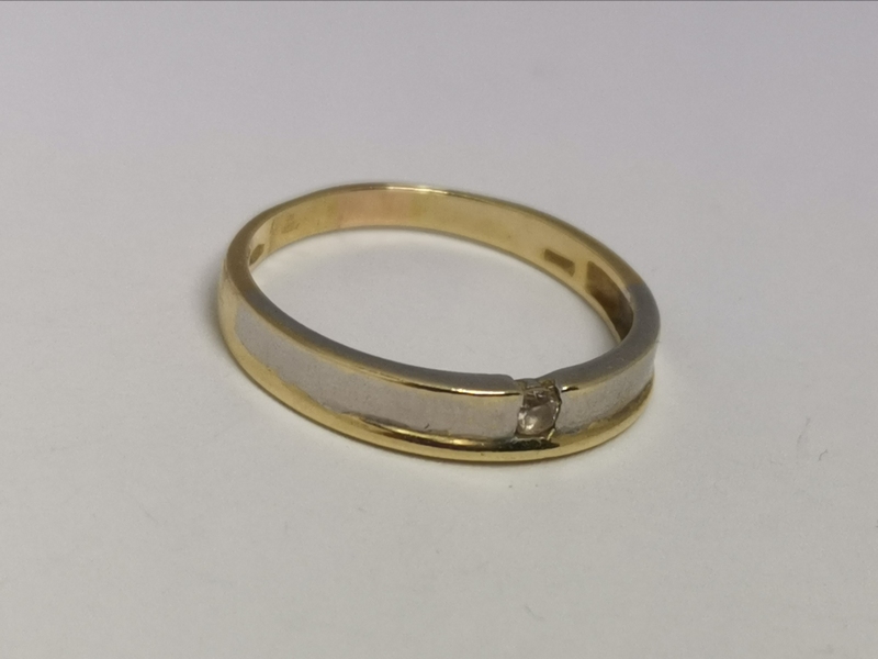 Jednoduchý, elegantní zlatý prsten s malým zirkonem. Prsten je kombinovaný ze zlata žlutého a matného zlata bílého. Velikost 55 patří mezi velikosti středního prstu.