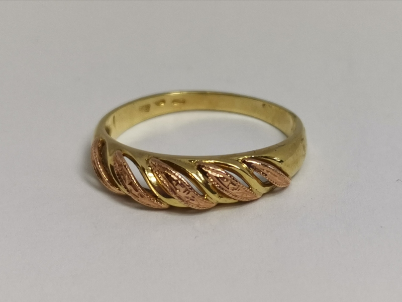 Krásný jemný prsten ze žlutého zlata, zdobený ručně rytými lístky z červeného zlata. Obroučka je pevná. Je moderního designu. Velikost 59 patří mezi velikosti většího prstu.