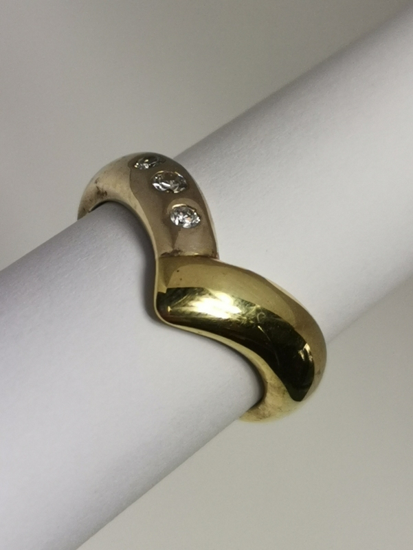 Masívní zlatý prsten ve tvaru špičky, polovina prstenu je z bílého zlata, polovina ze zlata žlutého. V bílém zlatě jsou vsazeny tři zirkony. Je moderního designu. Obroučka je velice pevná, masívní stejně tak, jako celý prsten. Velikost 54 patří mezi velikosti středního prstu.