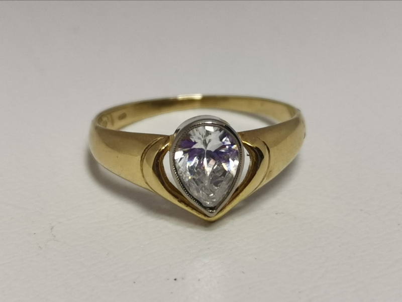 Krásný zlatý prsten ze žlutého zlata, zdobený velkým zirkonem ve tvaru kapky, která je zasazená v bílém zlatě. Je moderního designu. Velikost 54 patří mezi velikosti normálního prstu. Prsten můžeme nosit samotný, tím podtrhneme jeho krásu. Ale může být také doplněn ostatními menšími prsteny, ze kterých bude vynikat.