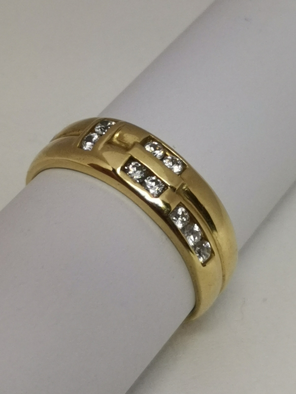 Krásný jednoduchý zlatý prsten, který je zdoben několika malými bílými zirkony. Je moderního designu. Velikost 59 patří mezi velikosti většího prstu. Prsten můžeme nosit samotný, tím podtrhneme jeho krásu. Ale může být také doplněn ostatními menšími prsteny, ze kterých bude vynikat.