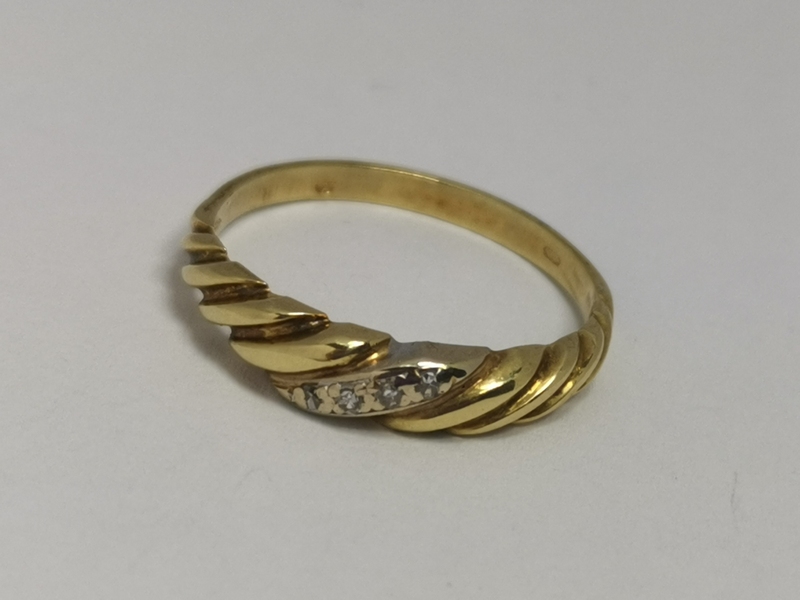 Krásný zlatý prsten ze žlutého zlata, zdobený několika malými zirkony. Je hladký, jednoduchý, elegantní. Má silnou obroučku. Velikost 55 patří mezi velikosti středního prstu. Prsten může být použit jako zásnubní.