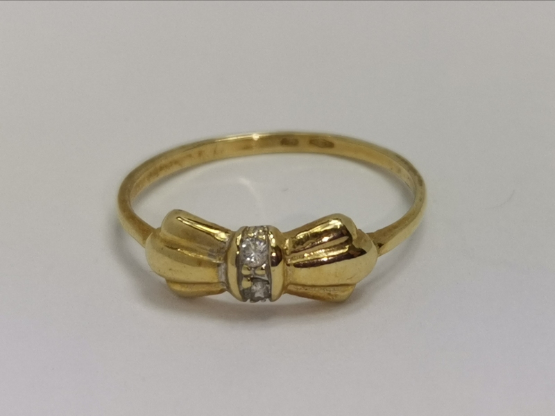 Krásný zlatý prsten ze žlutého zlata ve tvaru mašle zdobený dvěma zirkony. Je moderního designu. Velikost 57 patří mezi velikosti většího prstu.