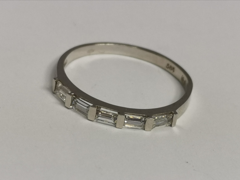 Jemný, jednoduchý zlatý prsten z bílého zlata, který je zdoben malými obdélníkovými zirkony v řadě. Zirkony jsou cca v délce 1/3 kruhu. Velikost 59 patří mezi velikosti většího prstu.