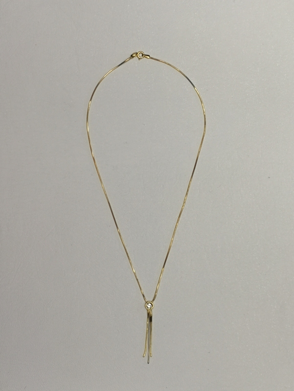 Zlatý náhrdelník ze žlutého zlata s bílým zirkonem a třemi visícími ocásky, z nichž prostřední je z bílého zlata, zakázková ruční práce. Náhrdelník krásně kopíruje krk, zirkon sedí na klíčních kostech. Velice jemný, něžný, jedinečný.