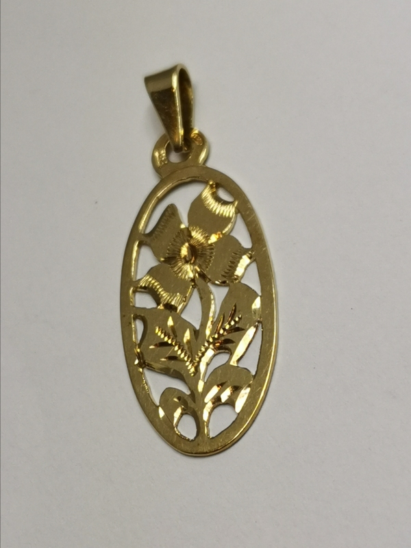Nádherný přívěs destička ve tvaru oválu ze žlutého zlata. Do destičky je ručně vyřezaná květina, která je dozdobena rytím. Krásná česká ruční práce.