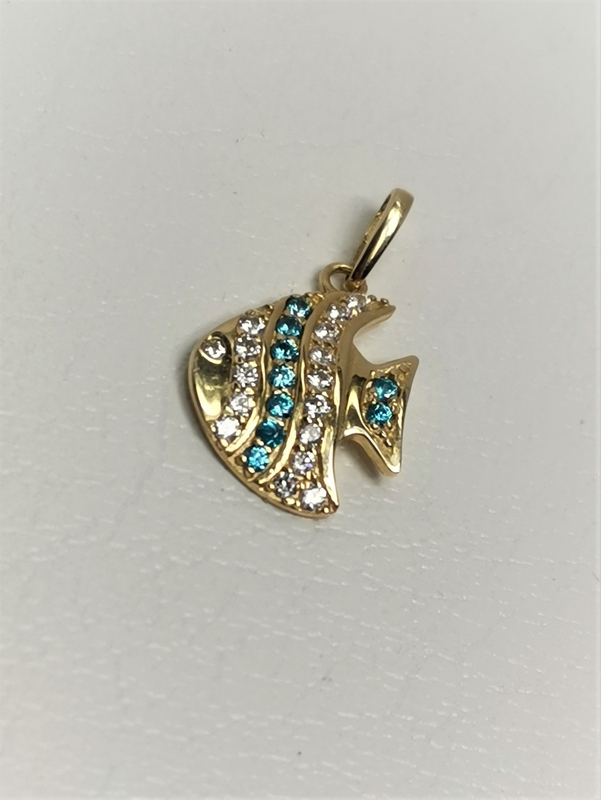 Krásný zlatý přívěs ryba, která je zdobena bílými a tyrkysově modrými zirkony