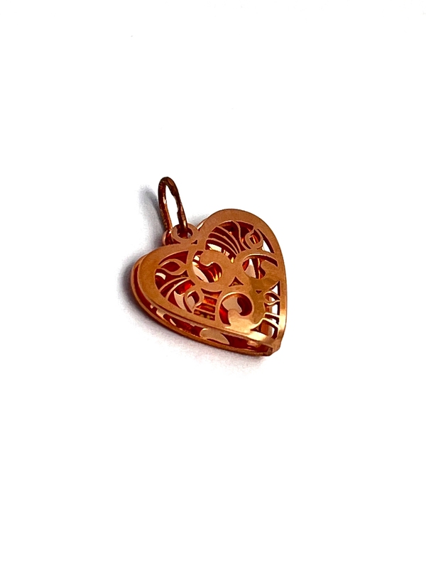 Nádherný přívěs srdce je vyroben z červeného zlata. Skládá se ze dvou, jedno je prořezávané, druhé hladké. Možno nosit oboustranně.