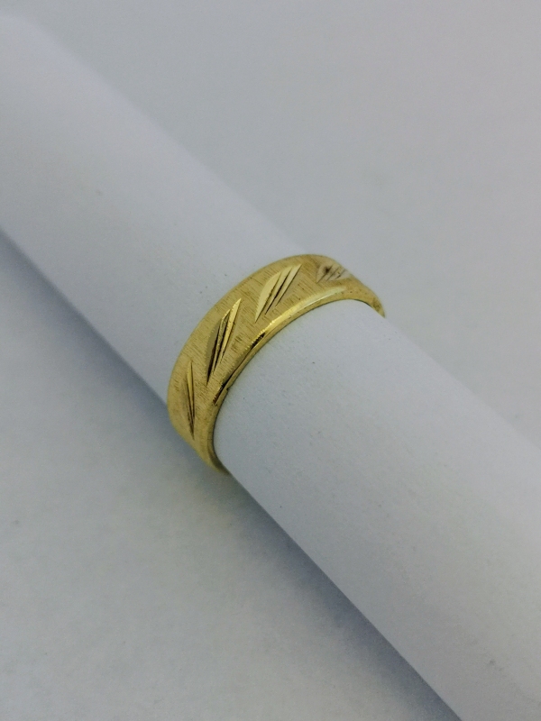 Velice krásný zlatý prsten. Je vyroben ze žlutého zlata. Je to jednoduchý kroužek zdobený posaluxem. (Posalux - technika zdobení, strojní přímočaré vrypování jemných i hrubších vzorů na diamantovacím stroji diamantovou frézkou.) Prsten se tak krásně blýská. Prsten lze použít i jako snubní.