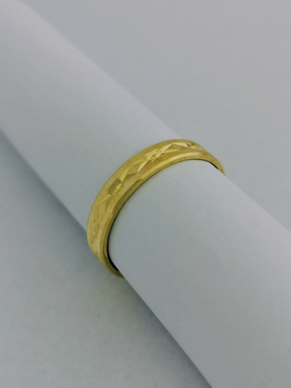 Velice krásný zlatý prsten. Je vyroben ze žlutého zlata. Je to jednoduchý kroužek zdobený posaluxem. (Posalux - technika zdobení, strojní přímočaré vrypování jemných i hrubších vzorů na diamantovacím stroji diamantovou frézkou.) Prsten se tak krásně blýská. Prsten lze použít i jako snubní.