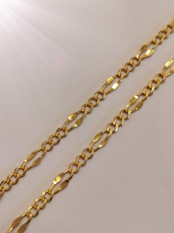 Zlatý řetízek figaro. Dlouhá očka mají prohnuté plošky, které jsou vyleštěny. Krásně se blýskají. Řetízek je silnější.